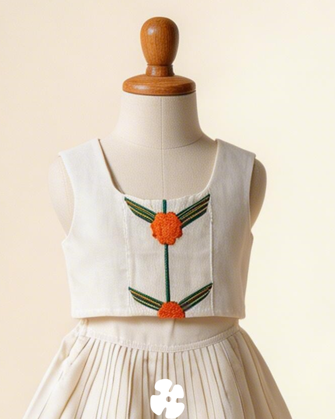 Sleeveless top with tie and elastic in the back of the top. Machine embroidery detailing in top and skirt. Full skirt with elastic waist band.