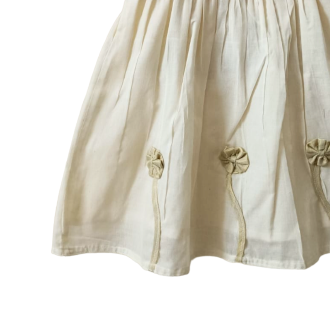 Fit flare princess cut frock with gold pipping on bodice and skirt with bow detailing
